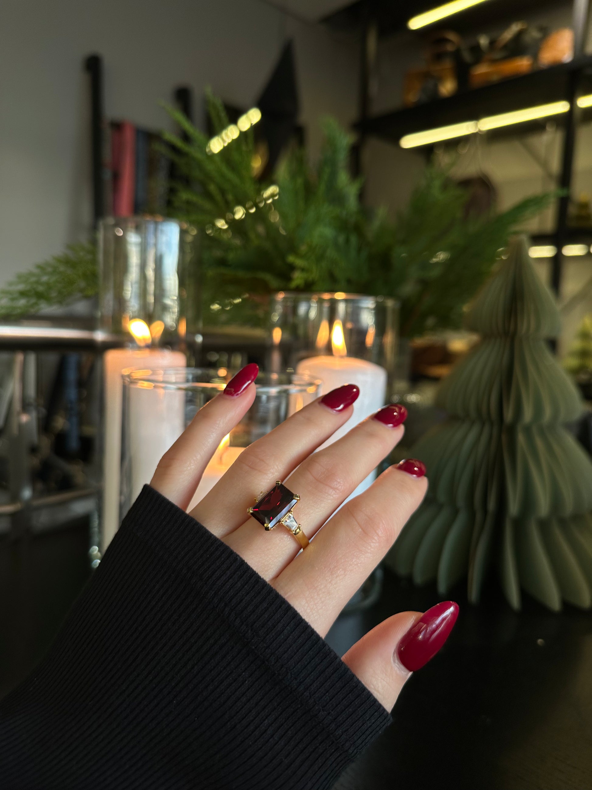Elevate your style with our exquisite 18kt double plated silver ring featuring a stunning Cherry-colored stone.