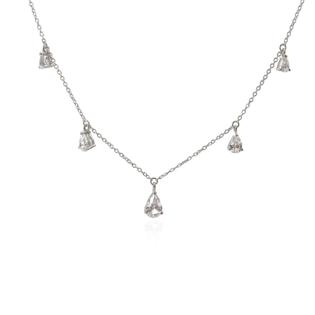 Introducing the DRIP Necklace, a masterpiece of elegance and grace. Crafted from 925 rhodium plated sterling silver, this exquisite necklace features a series of five dazzling drop-shaped white zirconia stones, meticulously handset to perfection.