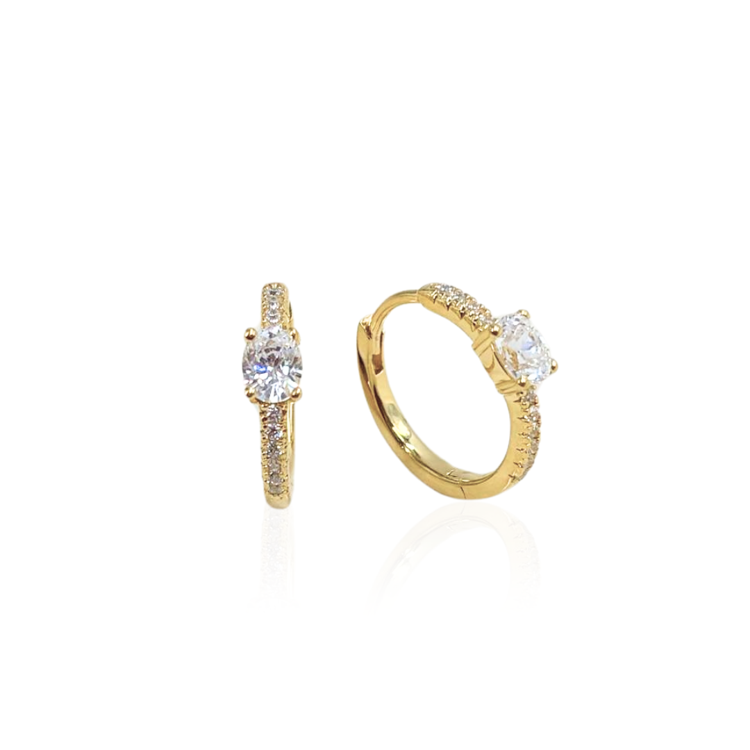 Your go-to earrings for a polished, statement-making look. Crafted from 925 sterling silver and plated with rich 18kt yellow gold, these hoops feature sparkling white cubic zirconia around a bold central stone, delivering the perfect balance of luxury and everyday elegance.