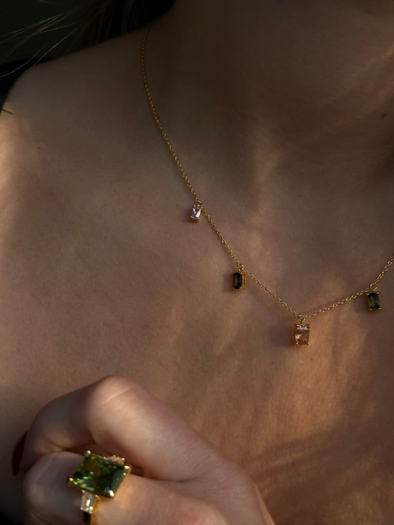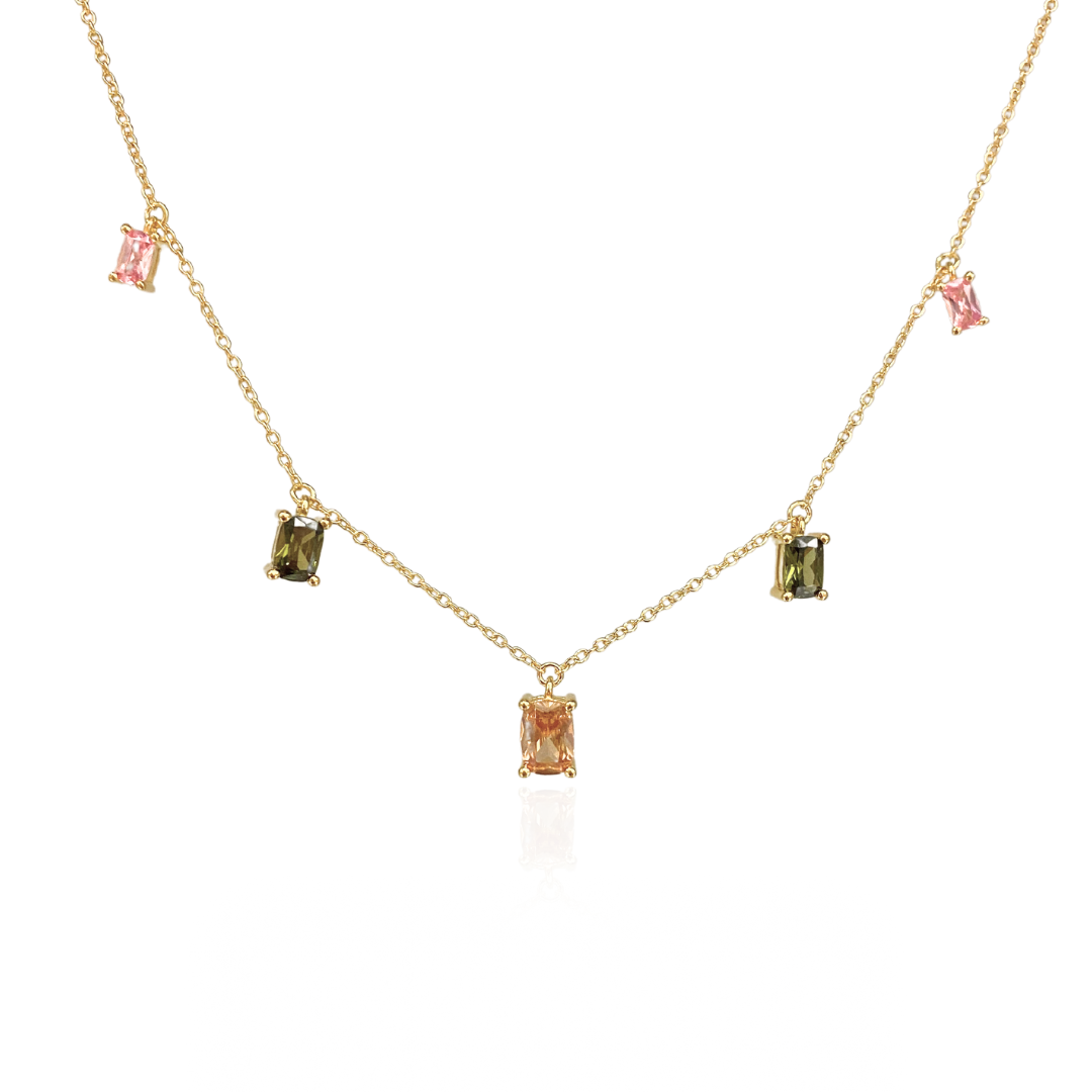 Introducing the Glow necklace, a radiant piece that captures the essence of elegance and color. Crafted from double 18kt gold plated 925 sterling silver, this exquisite necklace features a delicate design with dangling zirconia stones in enchanting shades of olive, champagne, and pink.
