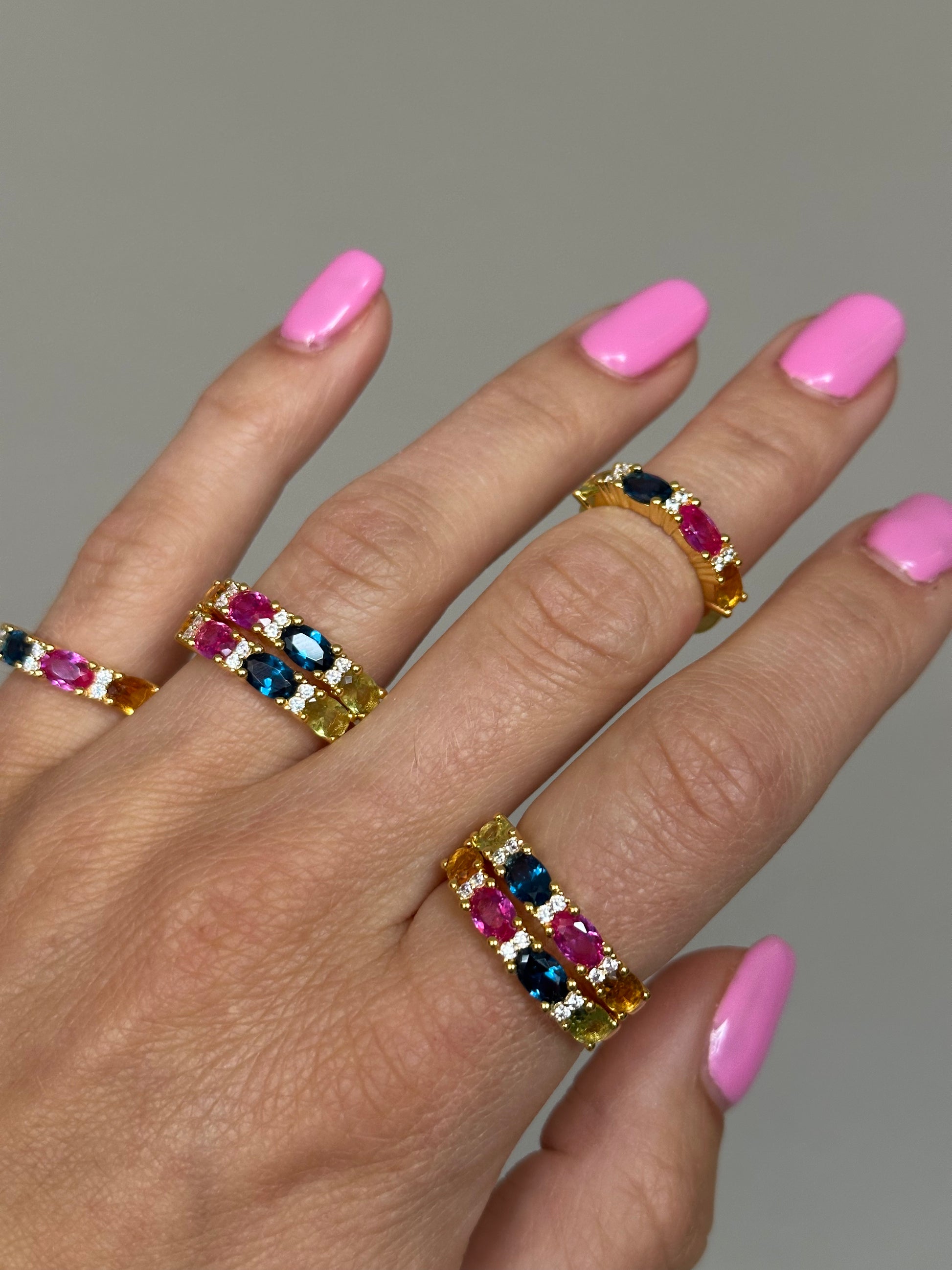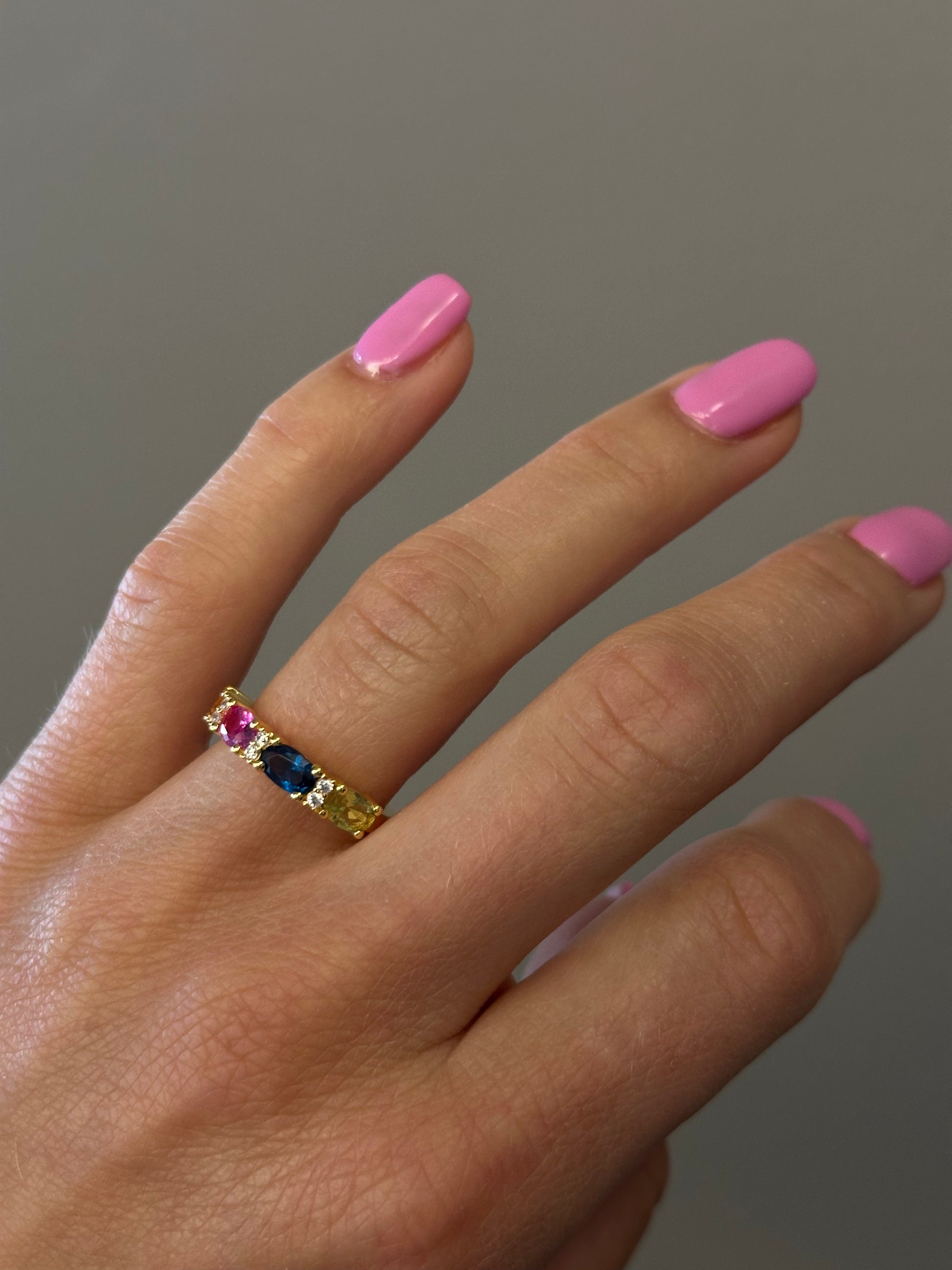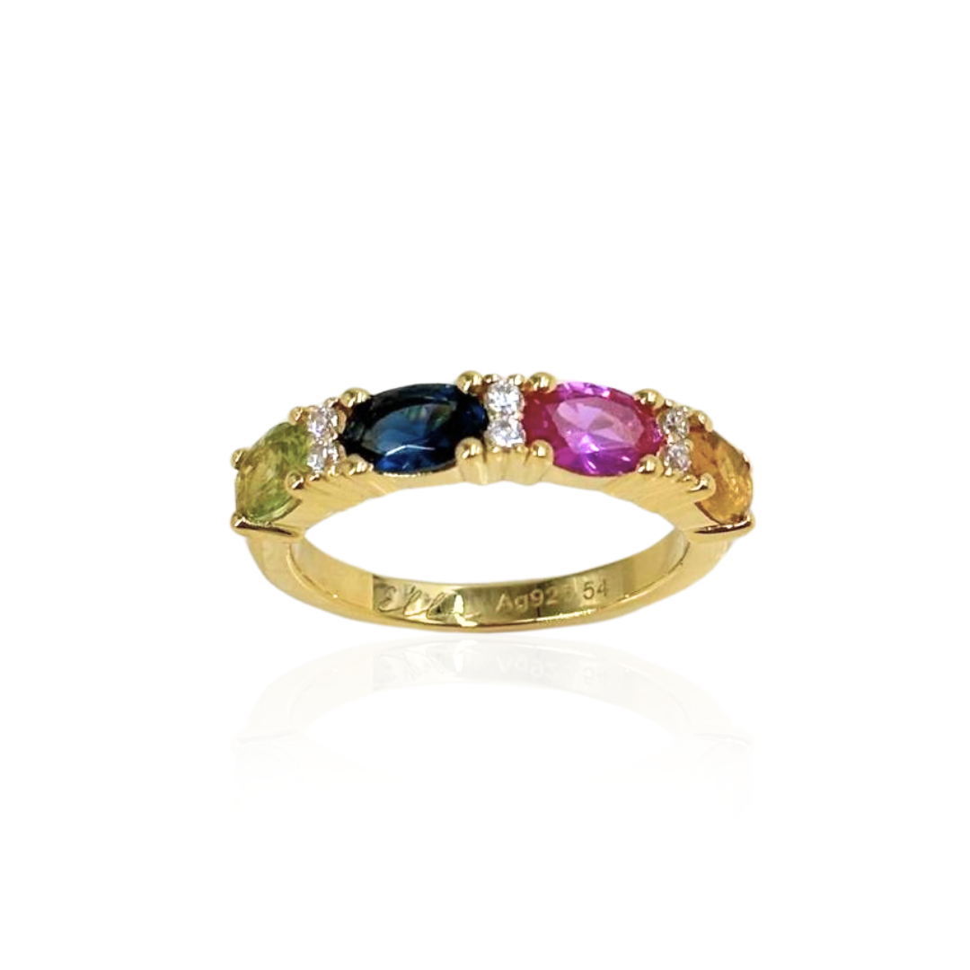 The colourful Opal ring is crafted from 925 sterling silver and finished with a luxurious double layer of 18k gold plating, this ring features a radiant mix of multicoloured marquise-cut stones. Between each burst of colour, brilliant white stones add a touch of sparkle and elegance. Opal is perfect for stacking or wearing solo as a bold statement of your unique style.
