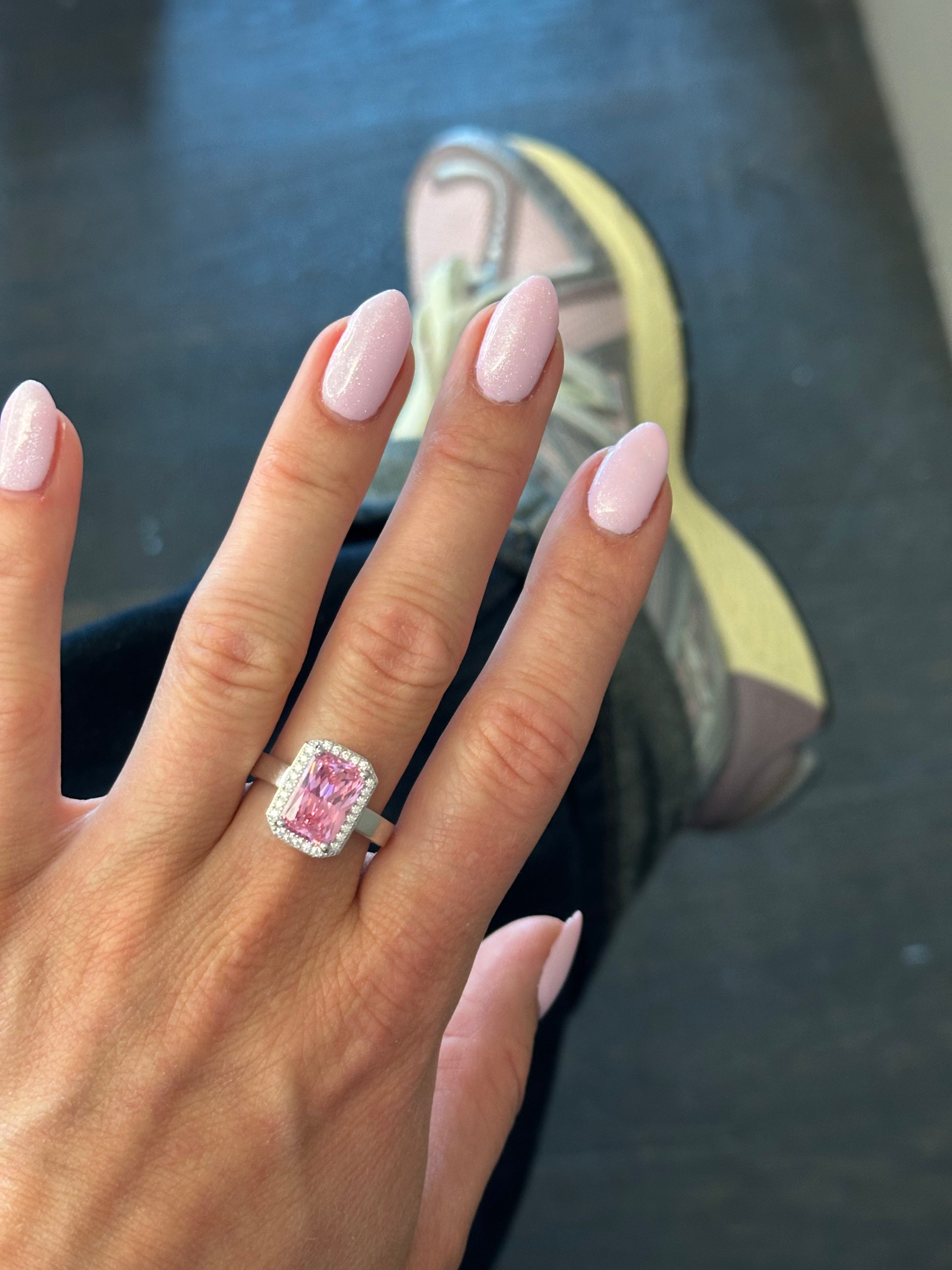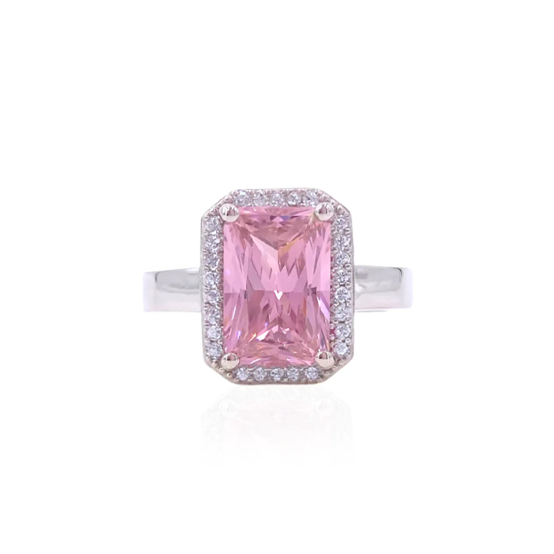 The Rosé ring is a stunning new colour in our cocktail collection. The ring is crafted in 925 sterling silver with rhodium plating. At its center is a emerald-cut pink stone glows with vibrant colour, framed by a delicate halo of shimmering white cubic zirconia.