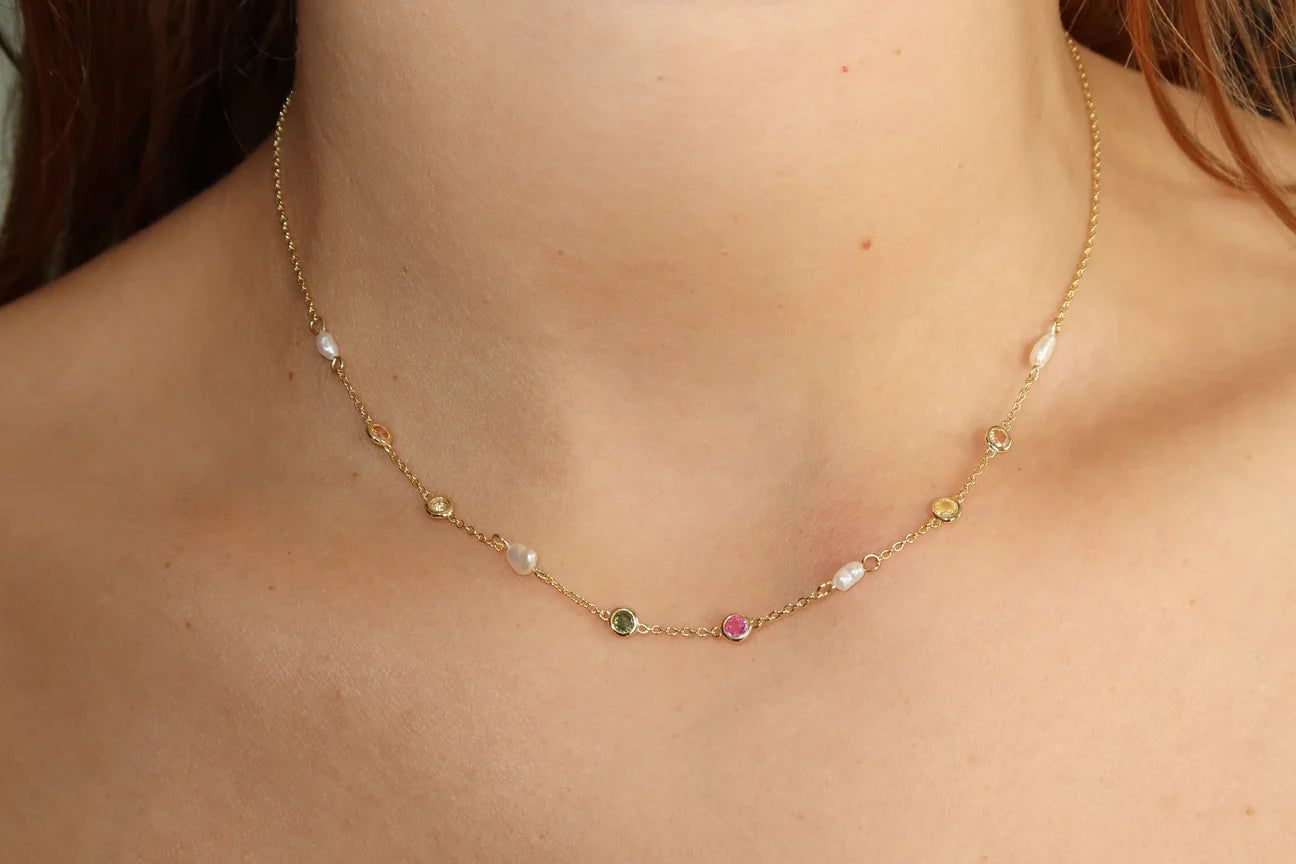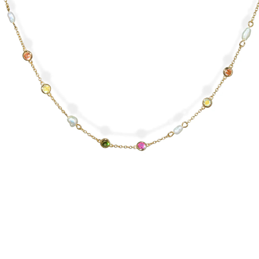 Introducing the SALTY necklace, crafted from double 18kt gold-plated 925 sterling silver, perfectly complementing the SALTY ring and huggie earrings. This striking necklace features vibrant colored zirconia stones, with delicate pearls set in between. Its unique design blends elegance with playful charm, making it a standout accessory that pairs beautifully with the rest of the SALTY collection for a coordinated, sophisticated look. The necklace is 45cm long.